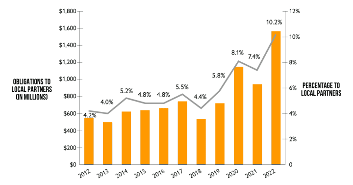 USAID released a progress report on localization last week, titled “Moving Toward a Model of Locally Led Development.” The headline figure is that the agency gave $1.6 billion of direct funding to local organizations in the fiscal year that ended in September 2022 — around 10.2% of all eligible funding. You will notice that this is way below its goal of 25%. But it is progress from the previous year’s figure of 7.4%.